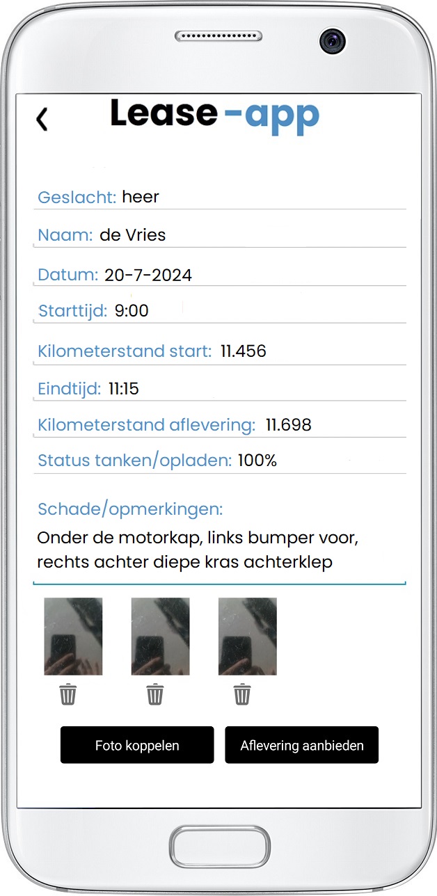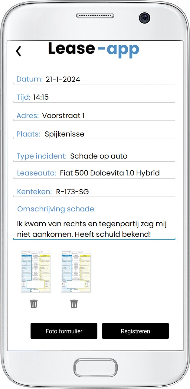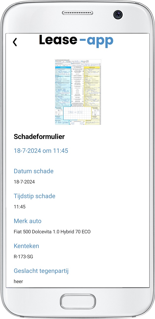 Uw klanten kunnen ter plekke via de Lease-app schadeformulieren en incidenten direct melden, inclusief het meesturen van foto’s. Dit versnelt het schadebeheerproces en zorgt voor nauwkeurige documentatie.