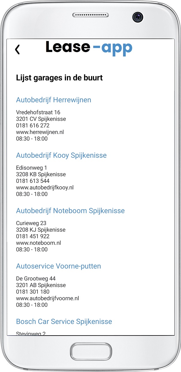 Met Lease-app hebben uw klanten toegang tot een lijst met garages in de regio en andere faciliteiten die u aanbiedt. Dit zorgt voor extra gemak en verhoogt de klanttevredenheid. U levert een lijst met garages en wij zorgen dat op basis van postcode de garages in de buurt in de Lease-app staan.